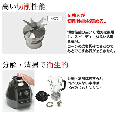 区分サイズ約 幅230×奥行270×高さ515mm質量:約 6kg容量2.0L(処理量 1.5L)定格時間15分(連続使用は4分毎に2分以上休ませる)コード長2.15m●切削性能の高い6枚刃を採用し、スピーディーな食材処理を実現しました。