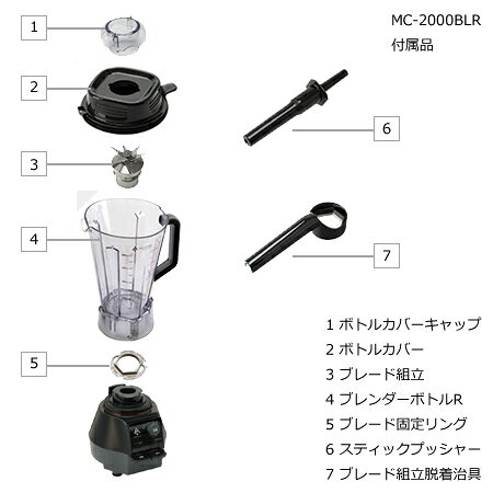 ●付属品・スティックプッシャー・ブレード組立、脱着治具・ブレンダーボトル・ボトルカバー・ボトルカバーキャップ●電源:単相100V 50/60Hz●消費電力:930W●回転数:約3,000〜約24,000回/分(無段階調整)、パルス動作:約24,000回/分【cookcook、クッククック、厨房用品、厨房機器・設備、ミキサー・ブレンダー、エスシーテクノ、エス・シー・テクノ、原産地:中国、MC-2000BL、6-0823-0601、5-0742-0901、FBL6201、FBL-62、エスシーテクノ、SCテクノ、バイタミックス、バイタプレップ、ホテル、レストラン、和食、病院、施設、保育、幼稚園、学校、嚥下調整食、ジュース、スムージー、プリン、スープ、ドレッシング、おかゆ、】▼こちらもどうぞ▼マルチシェフ ブレンダー MC-2000BLSS ステンレスボトルマルチシェフ フードプロセッサー MC-1500FPS 中型 標準タイプマルチシェフ フードプロセッサー MC-1000FPS 中型 標準タイプマルチシェフ フードプロセッサー MC-1000FPM 中型 多機能タイプ●5,000円(税込)以上のご注文で送料無料にてお届けします。